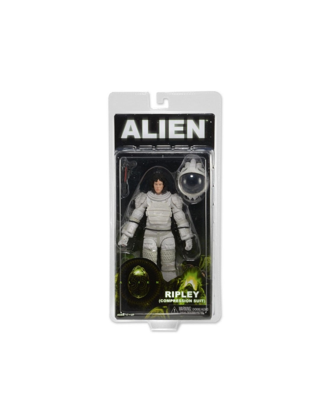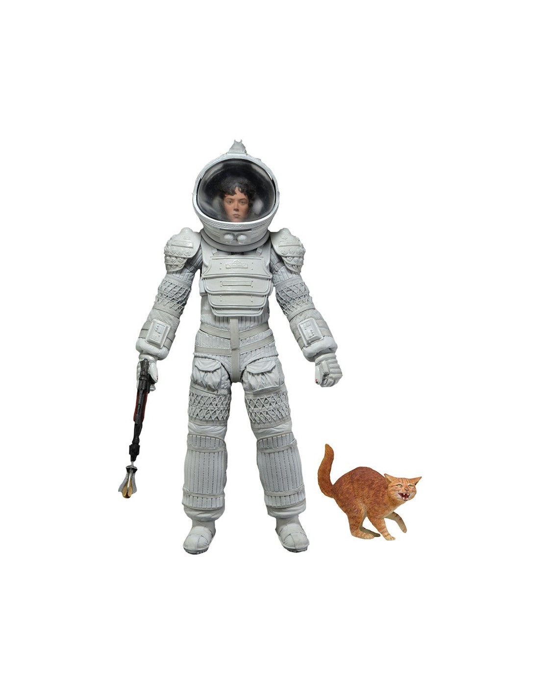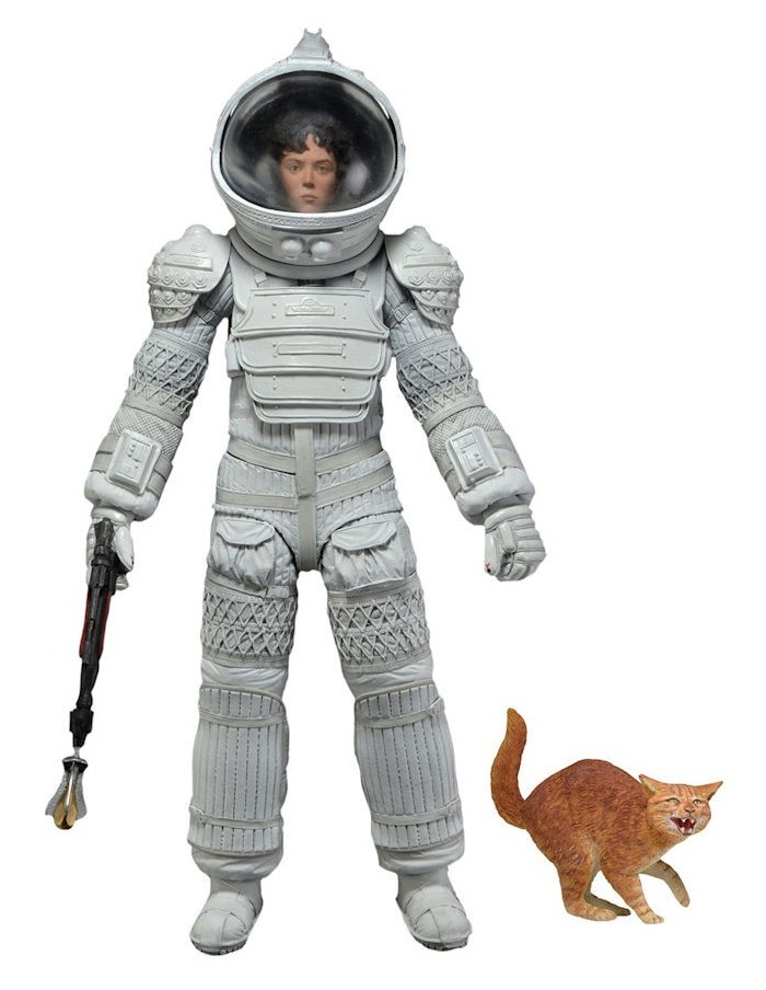 Ripley in Nostromo Jumpsuit comes with flamethrower and Jonesy the cat. Dallas in Compression Suit comes with removable helmet, pistol and flashlight. Ripley in Compression Suit comes with removable helmet, harpoon gun with two different attachments, and a frightened version of Jonesy the cat. Each fully articulated figure stands approximately 7″ tall and comes in special 35th Anniversary packaging.