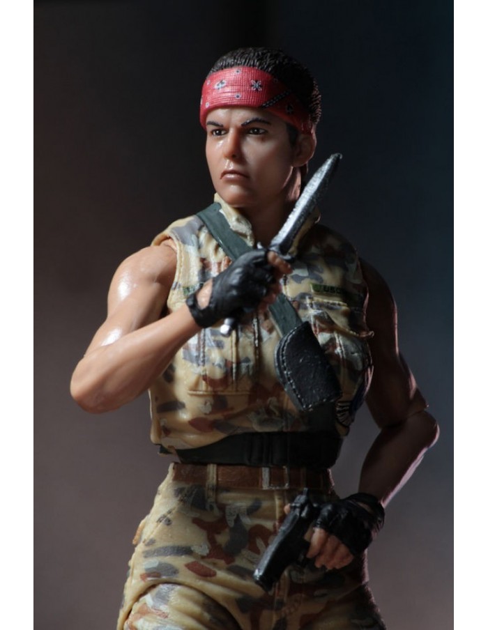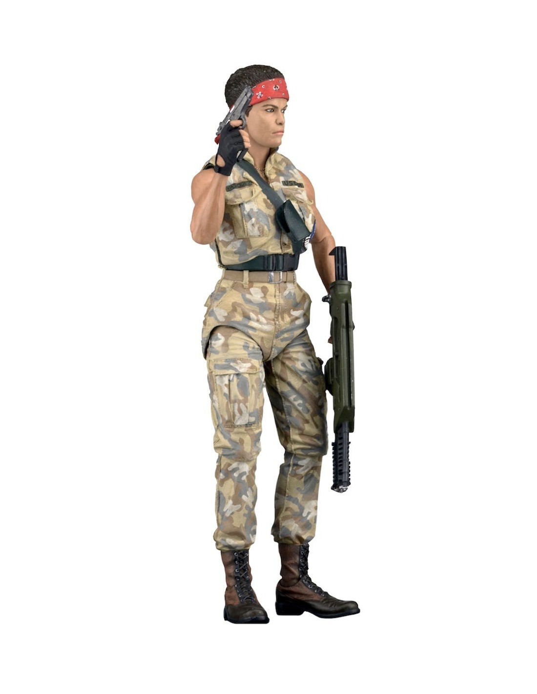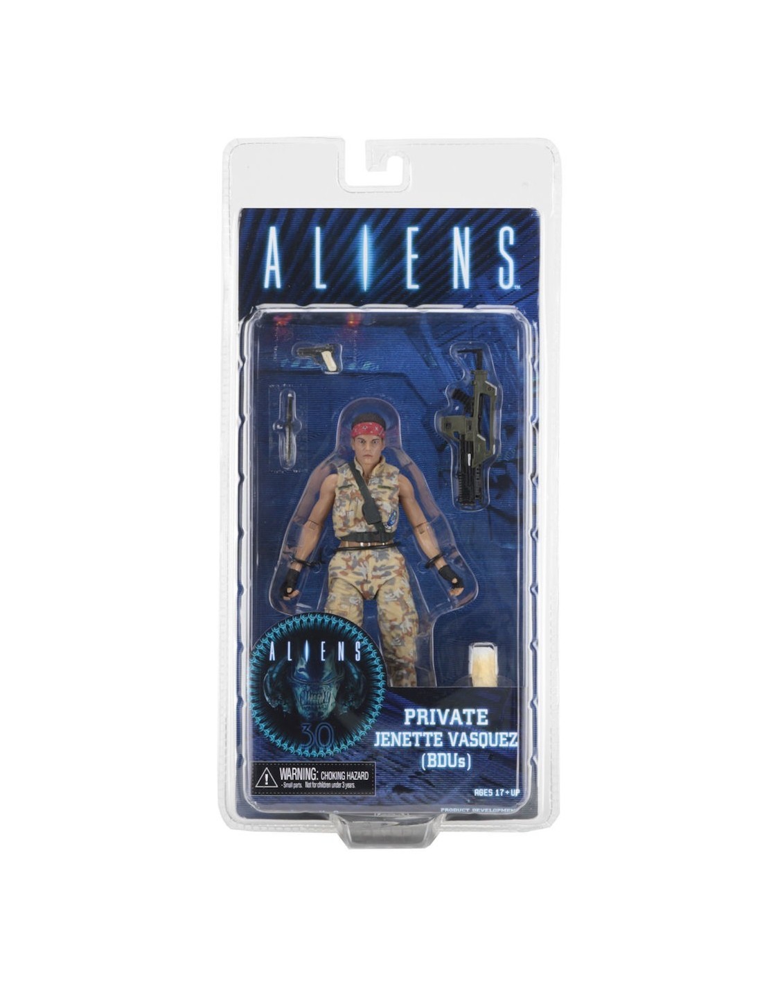 Vasquez stands approximately 6.5″ tall and features the likeness of Jenette Goldstein. Vasquez is seen in her alternate outfit and the Marine gear is completely faithful to the movie, down to the “LOCO” detailing on the back of her vest. Vasquez has over 25 points of articulation and comes with pistol, knife and pulse rifle with attachable muzzle flash.