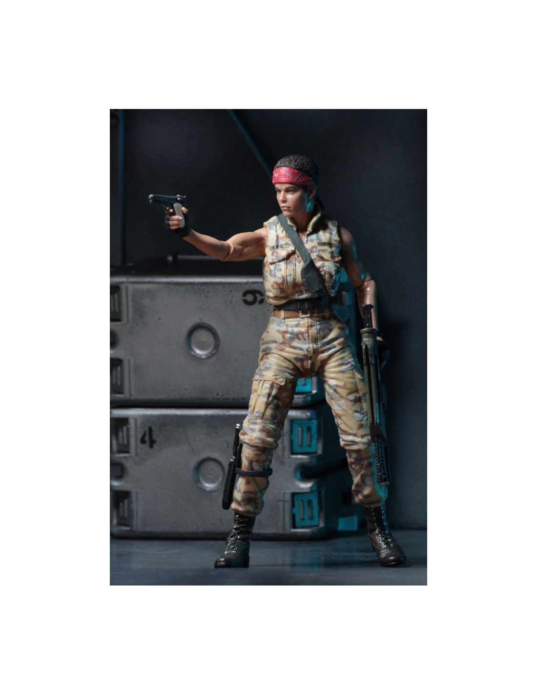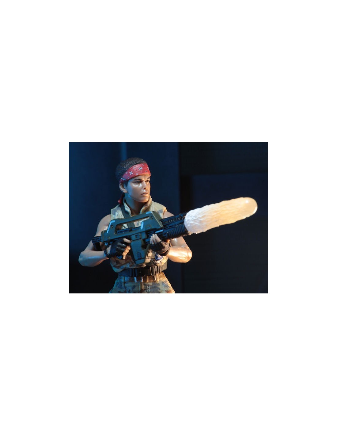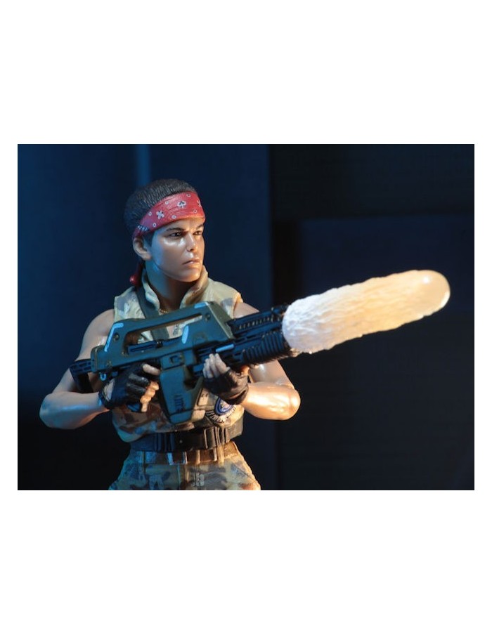 Ripley stands approximately 7″ tall, has over 25 points of articulation and features the likeness of Sigourney Weaver. She wears a bomber jacket over blue coverall and comes with pulse rifle accessory and attachable muzzle flash.