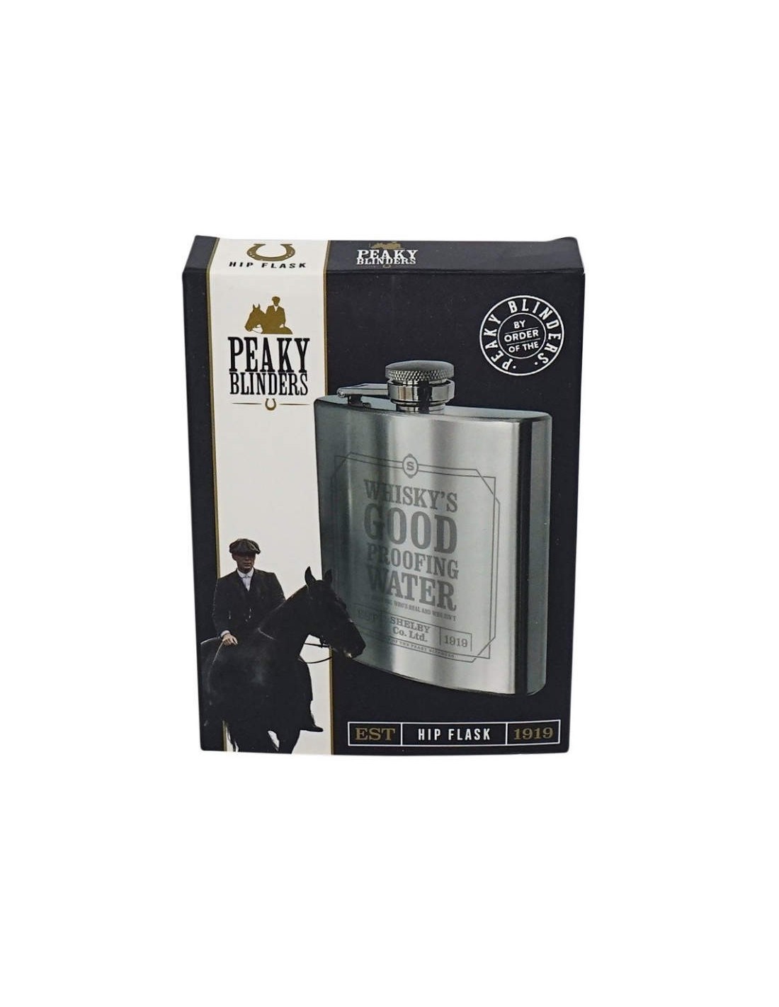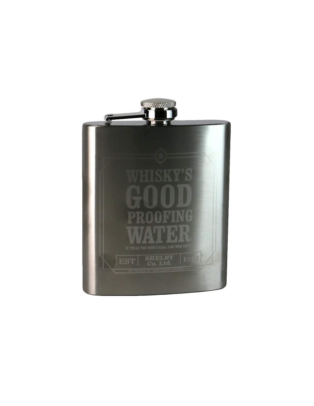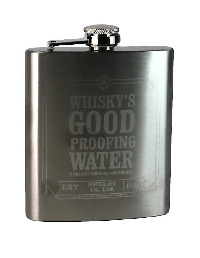This Peaky Blinders hip flask is perfect for use on the go at parties, festivals and and when you're out being a gangster! Featuring the quote 'Whiskey's Good Proofing Water, it tells you who's real and who isn't' in etched detail. Includes a captive top so the lid will never get lost. Comes in a branded gift box.