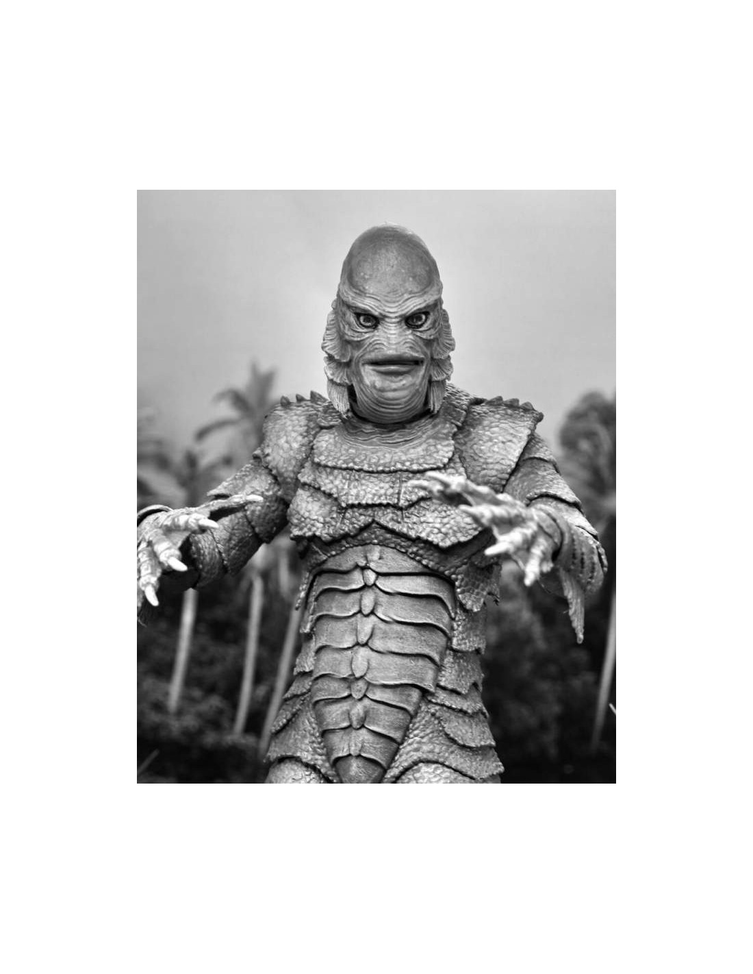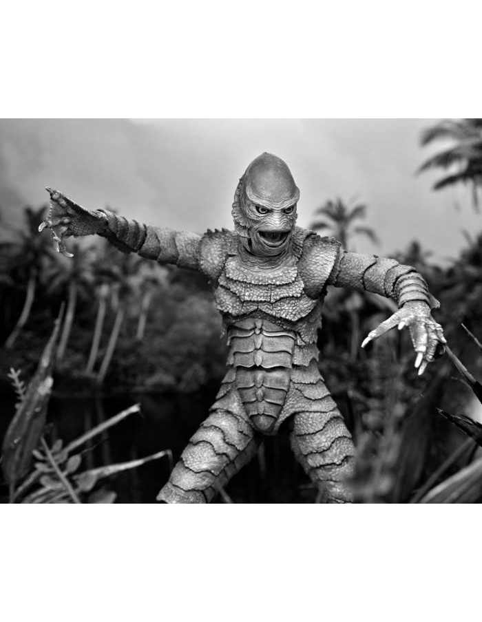 This 7” scale Ultimate Creature from the Black Lagoon action figure depicts the mysterious and terrifying Gill-man in extraordinary detail in classic silver screen black and white deco.