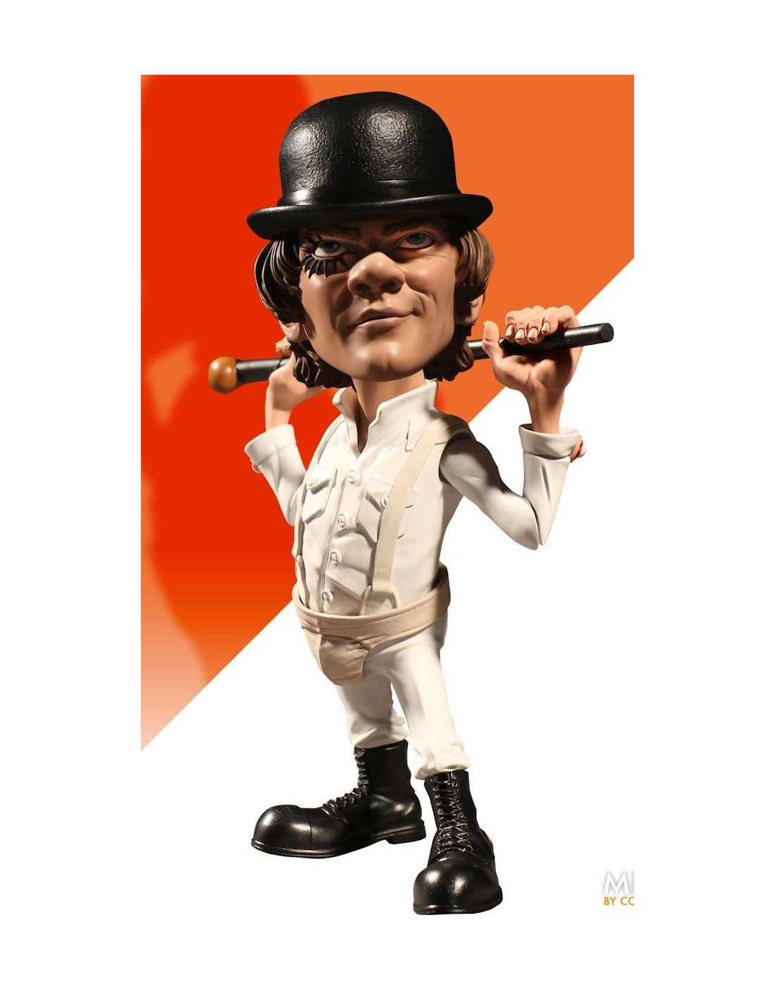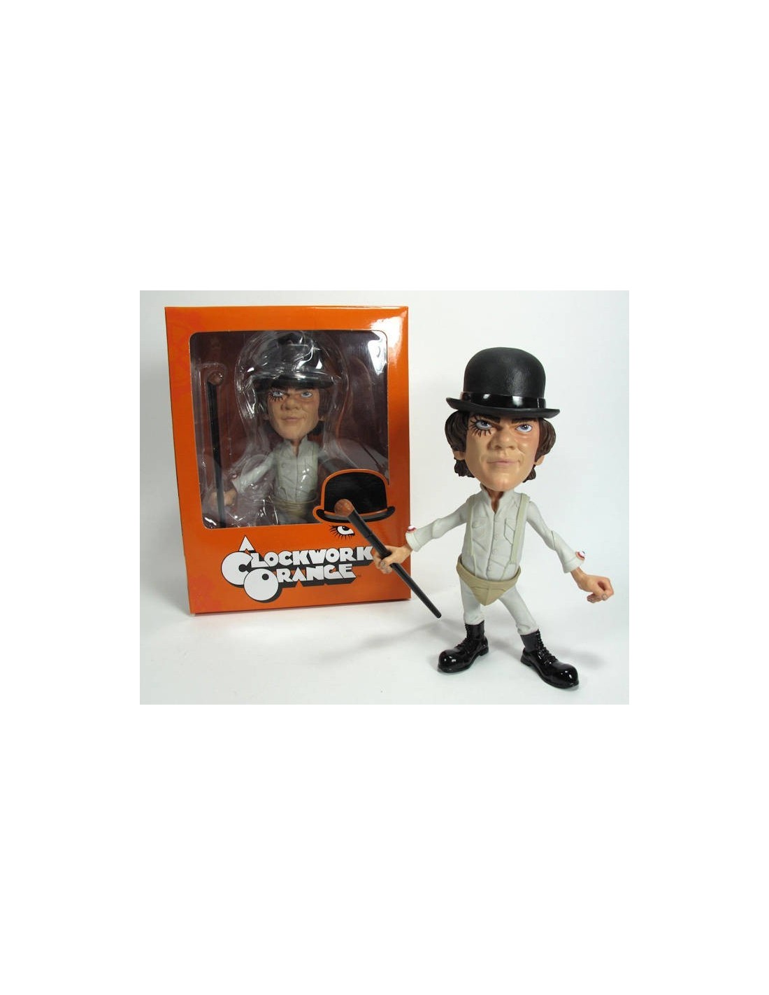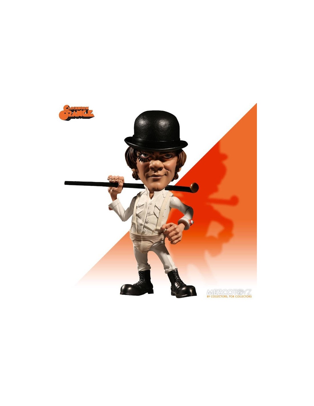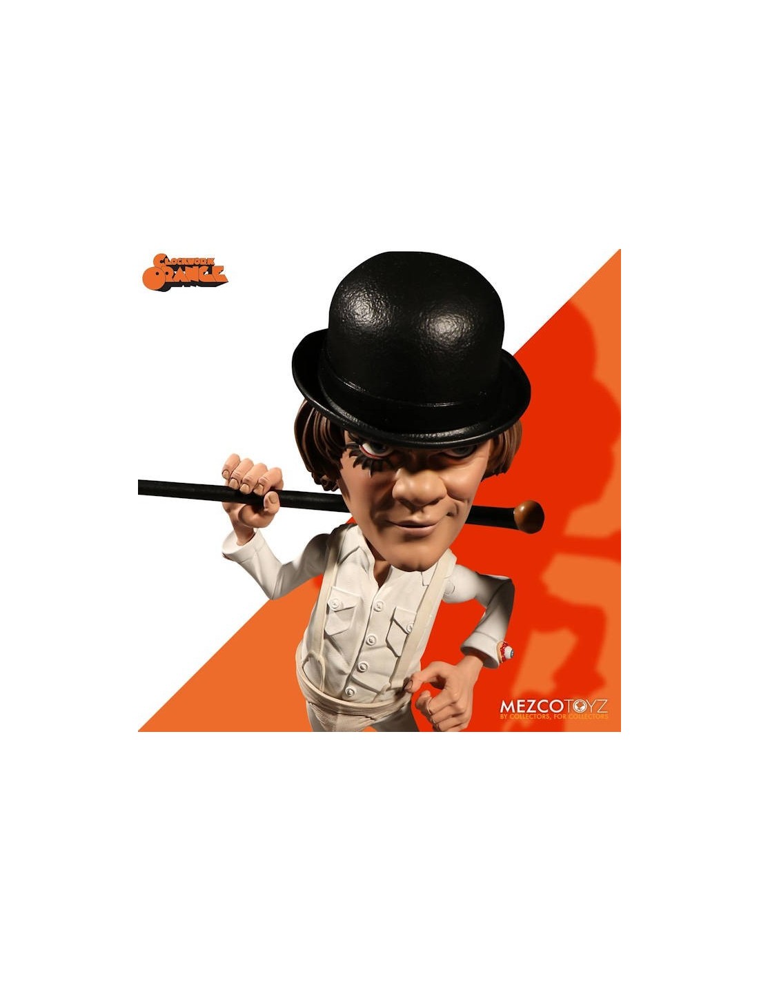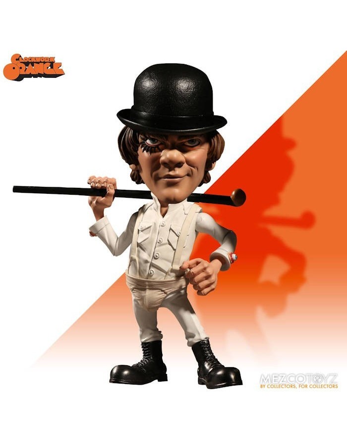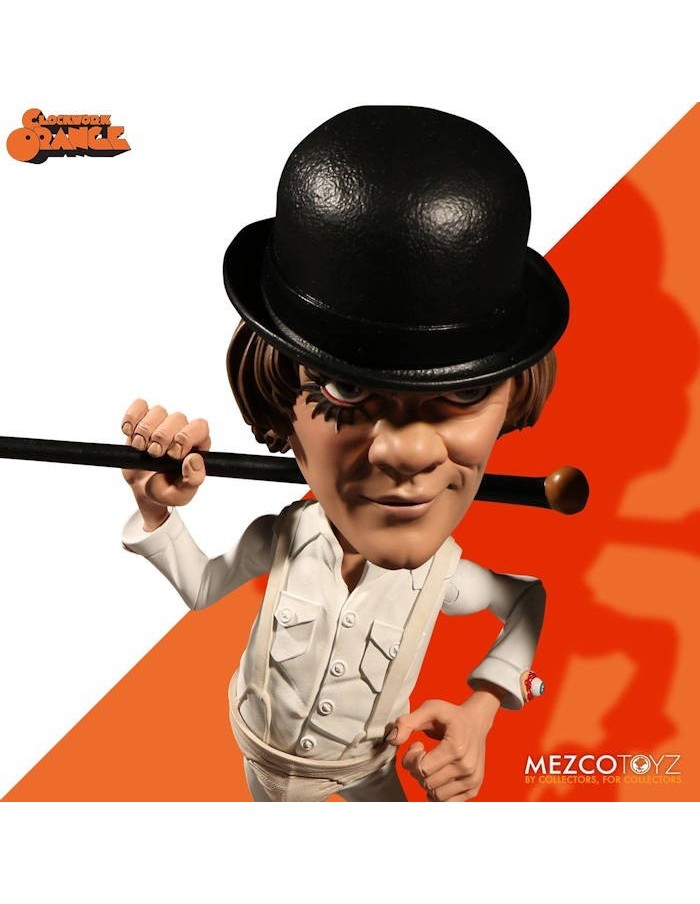 The latest character addition to Mezco's signature super-deformed style, Alex is presented in his now iconic white outfit with eyeball cufflinks, suspenders and athletic protector. Also sporting his trade mark bowler hat, walking cane. Of course Alex has eye liner and his sinister smirk as well.
