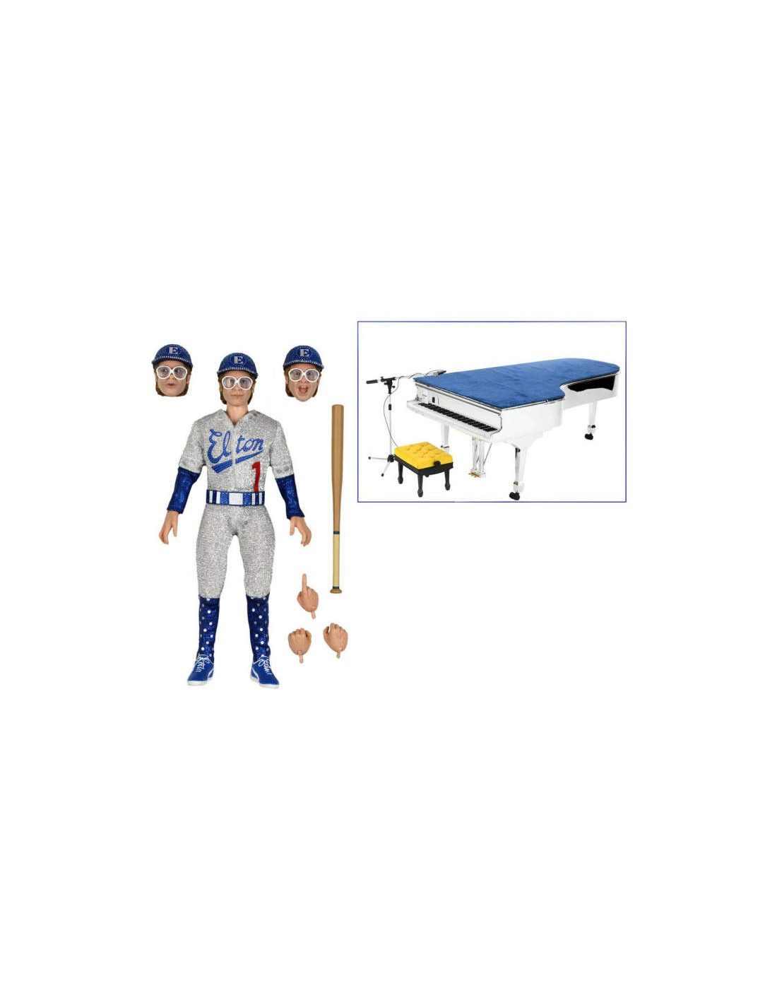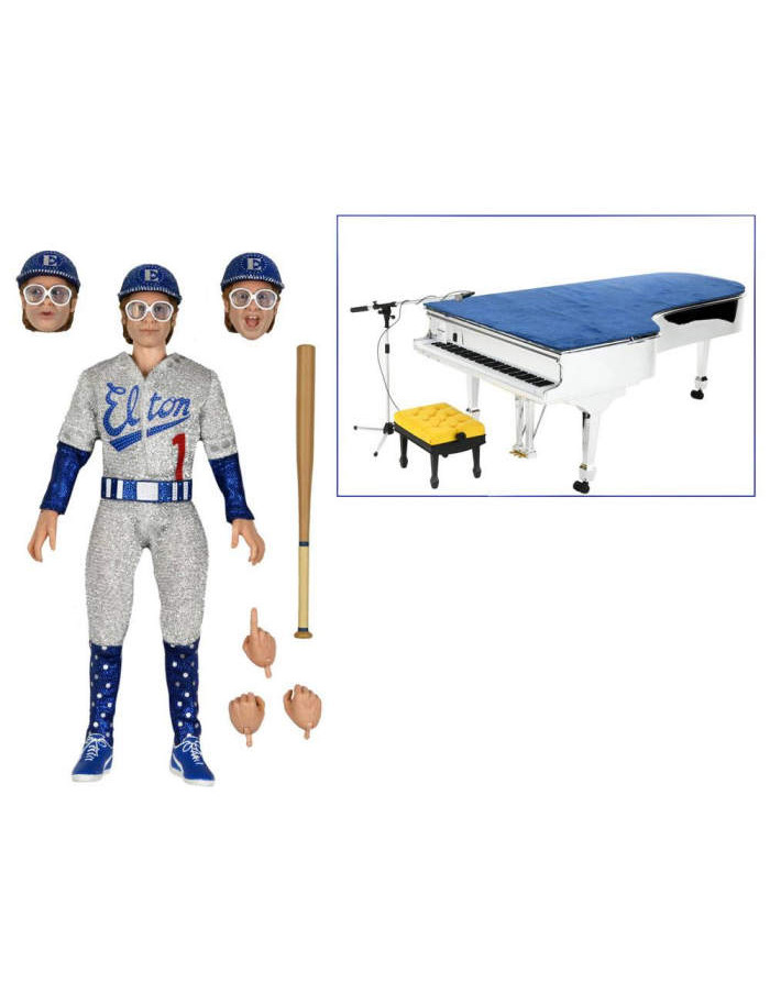 This deluxe set also includes Elton's baseball bat, piano bench, microphone stand, interchangeable hands, and three interchangeable heads with different expressions.