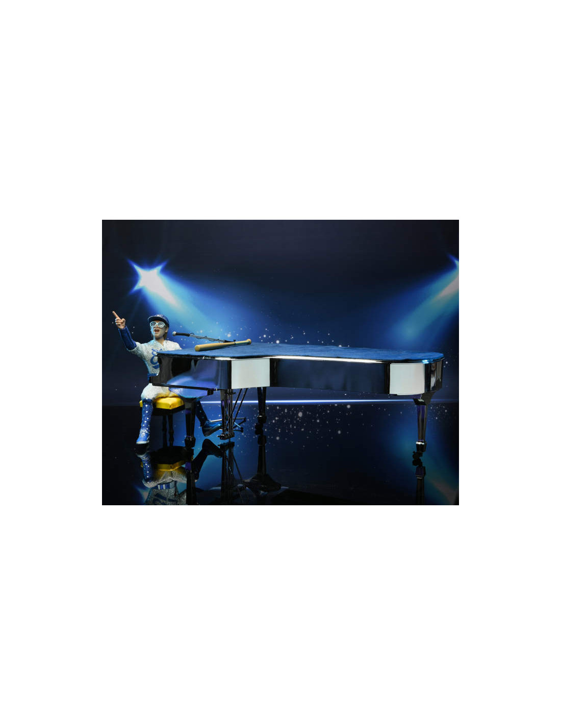 The Elton John Live in '75 action figure stands 8 inches (20.3 cm) tall and sports one of his most famous stage costumes: the glammed-up baseball uniform from his October 1975 concerts at Dodger Stadium, Los Angeles. These were the largest concerts ever by a solo artist at the time, and we've gone all out to commemorate that landmark occasion with a scaled piano as it appeared during the show!