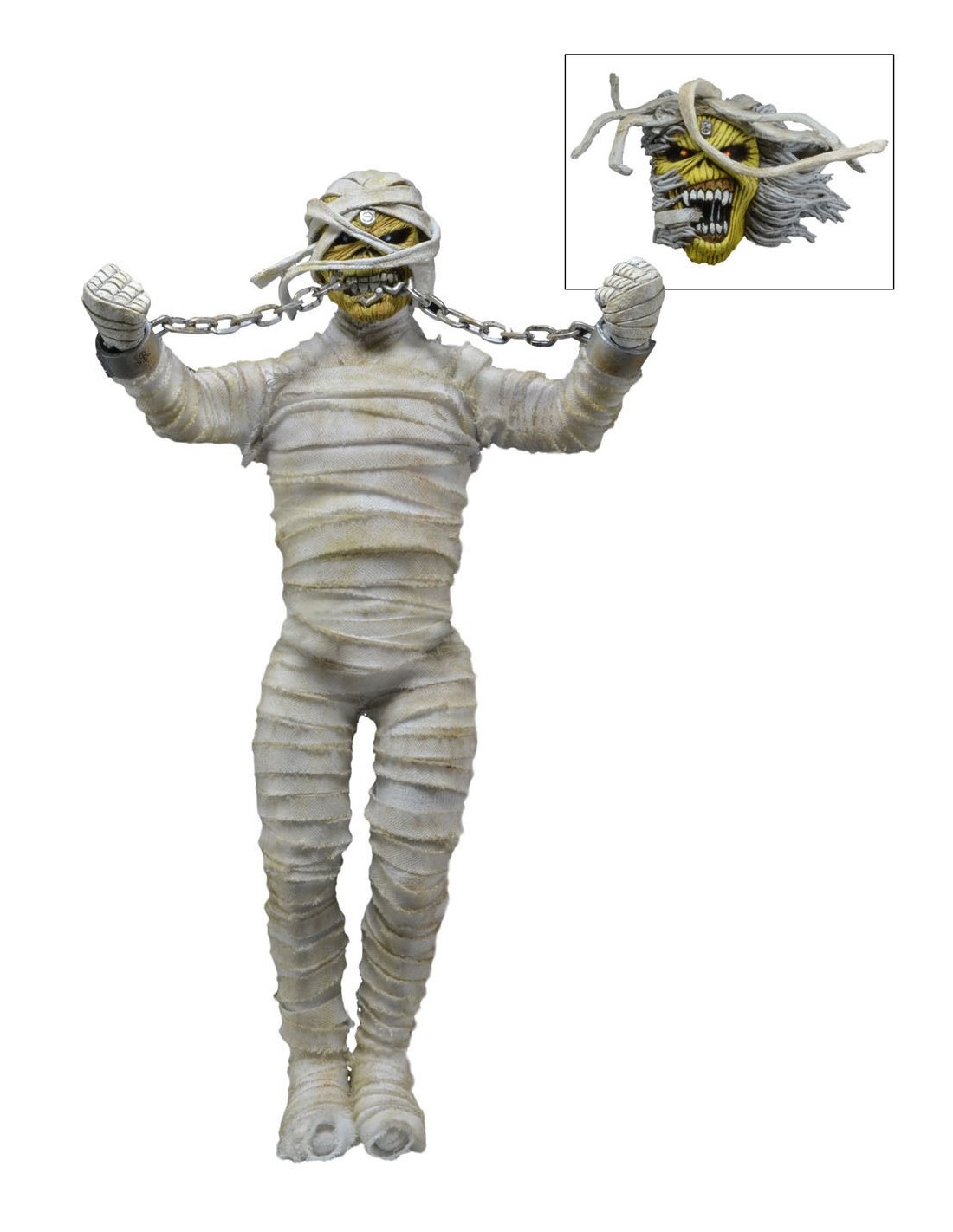 Based on the poster and program artwork from their groundbreaking 1984-1985 World Slavery Tour, this 20 cm tall Eddie features real metal chains that can be connected to the mouth or unhooked for when he breaks free. Also includes a bonus interchangeable second head based on the Somewhere Back in Time artwork, with the bandages stripped away to reveal more of the beast that lies beneath.