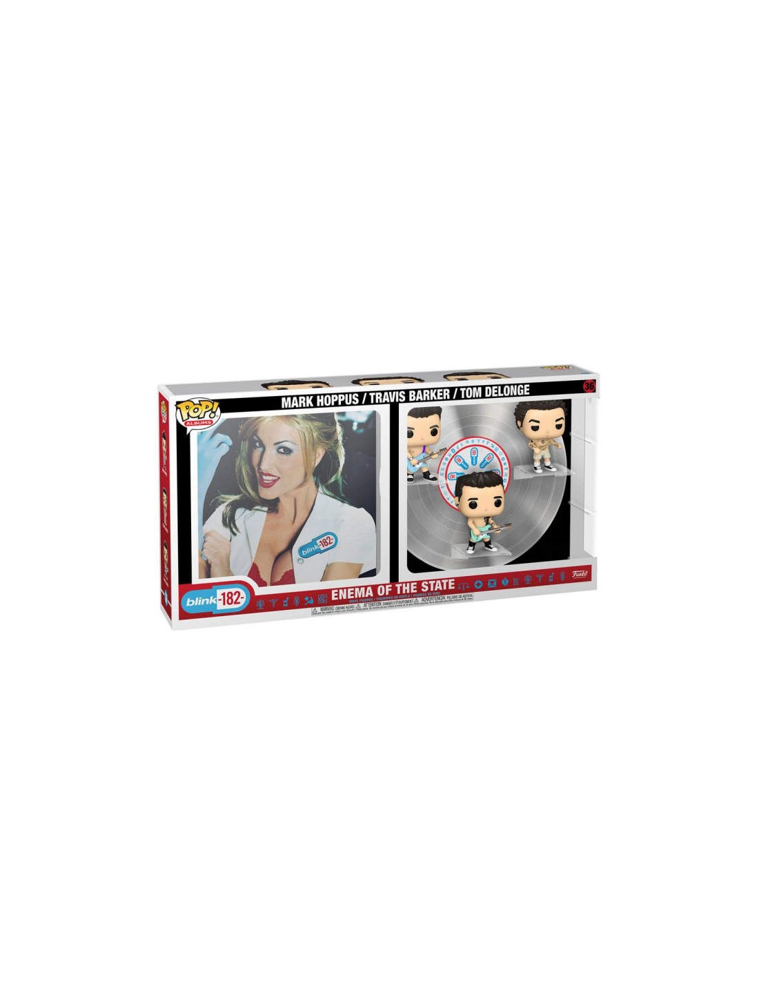 Put a spin on your Pop! Music set with this exclusive Enema of the State Pop! Albums Deluxe collectible. Rock on with Blink-182 Pops! Mark Hoppus, Travis Barker, and Tom Delonge while commemorating the 1999 release of the chart-topping album, Enema of the State. These Pops! stand on platforms around a record-backdrop, and next to them, the cover for Enema of the State is recreated in full color. This unique collectible comes in a prepackaged case that can be hung on the wall or displayed in your music collection.