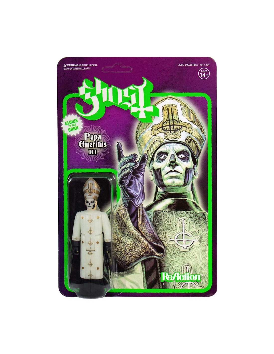 The band Ghost have captured the imaginations of heavy metal fans worldwide with their theatrical music and performances. Papa Emeritus III represents the 3rd incarnation of the band's charismatic leader and his 3.75" ReAction Figure comes in full regalia with a microphone accessory.