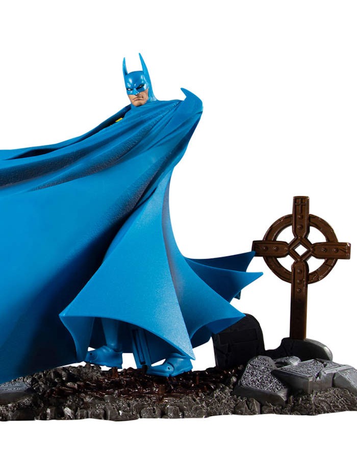- Batman includes, a large stylized cape, a fabric cape, a batarang, and a cemetery base