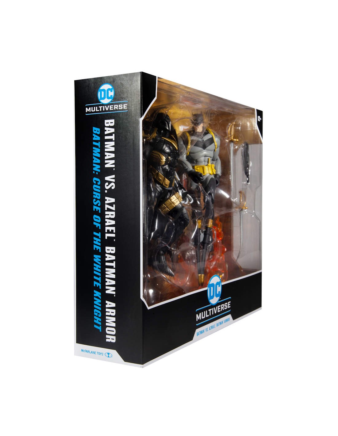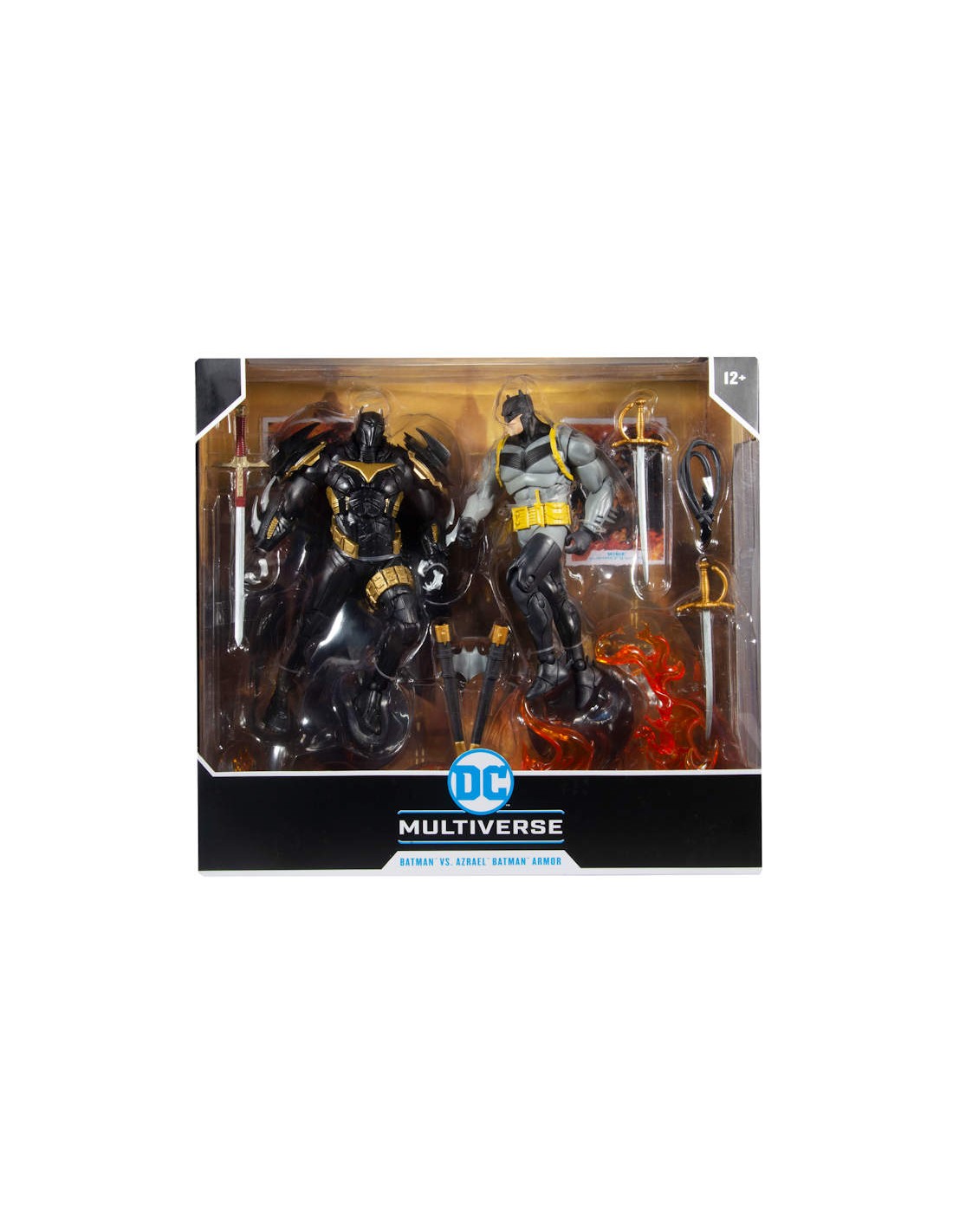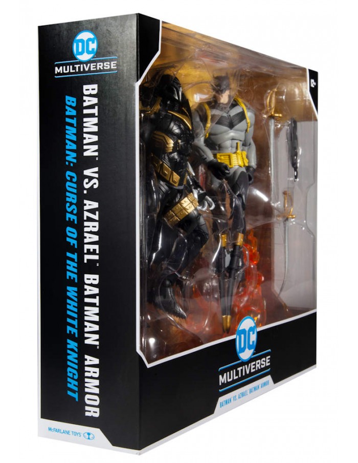 - Batman includes a Batarang with rope and two rapiers with sheath. Azrael includes his sword.