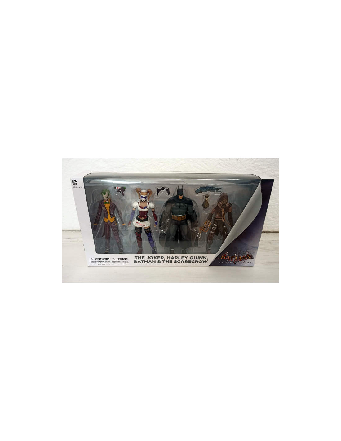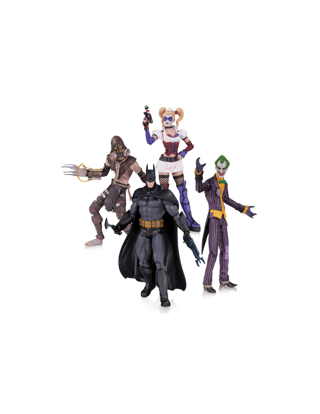 Based on the designs of the hit Batman: Arkham Asylum videogame comes this action figure 4-Pack with new deco! Batman, The Joker & Harley Quinn stand 18 cm H, and The Scarecrow stands 17 cm H.