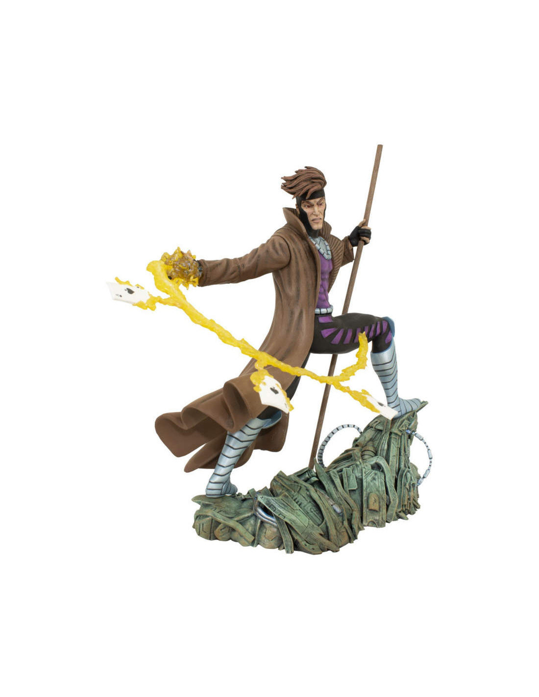 The ragin' Cajun is now the newest X-Men Gallery Diorama! Remy LeBeau, a.k.a. Gambit, grips his staff and throws some charged-up playing cards in this all-new 10" sculpture from DST. Standing on a mass of twisted metal, Gambit is the perfect addition to your X-Men collection!