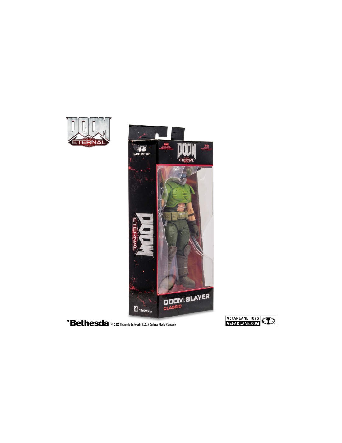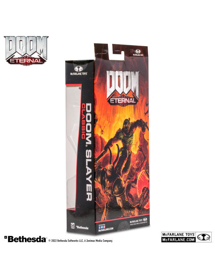 - Figure showcased in DOOM themed window box packaging.